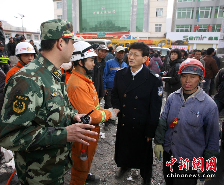 2010年4月16日10時(shí)許,國務(wù)委員、公安部部長孟建柱來到青海省玉樹藏族自治州玉樹縣地震災(zāi)區(qū)四川消防部隊(duì)玉樹教育局救援現(xiàn)場,詢問救援情況,并看望慰問消防官兵。4月14日07時(shí)49分許,青海省玉樹藏族自治州玉樹縣(北緯33.1,東經(jīng)96.7)發(fā)生7.1級(jí)地震。中新社發(fā) 劉忠俊 攝