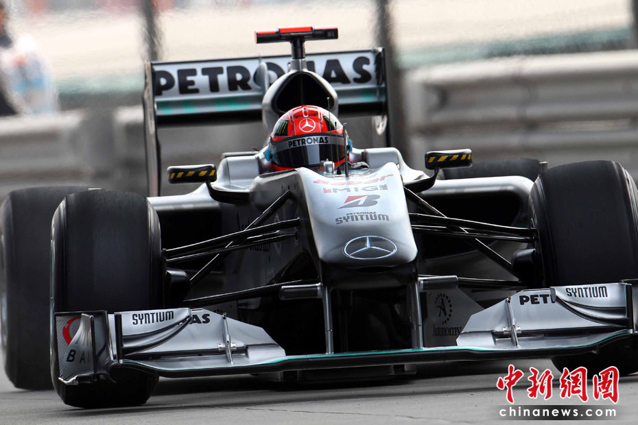 4月16日,2010國(guó)際汽聯(lián)F1世界錦標(biāo)賽上海站在上海國(guó)際賽車場(chǎng)開(kāi)始車手第一、第二次練習(xí)賽。圖為代表梅賽德斯GP車隊(duì)出戰(zhàn)的老車王、德國(guó)車手舒馬赫重回上海賽道。 中新社記者 任晨鳴 攝