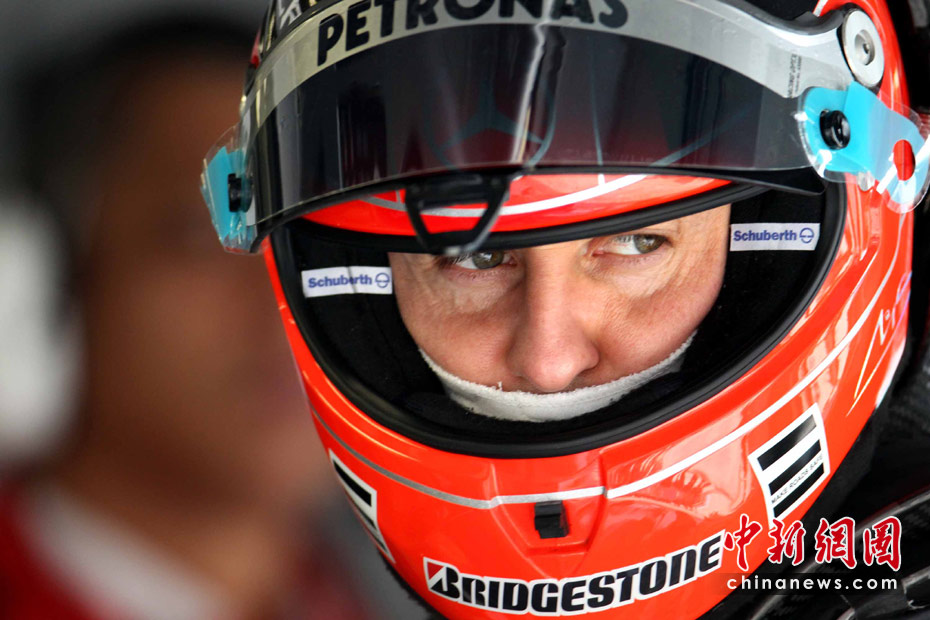 4月16日,2010國際汽聯(lián)F1世界錦標(biāo)賽上海站在上海國際賽車場開始車手第一、第二次練習(xí)賽。圖為代表梅賽德斯GP車隊出戰(zhàn)的老車王、德國車手舒馬赫重回上海賽道。 中新社記者 任晨鳴 攝