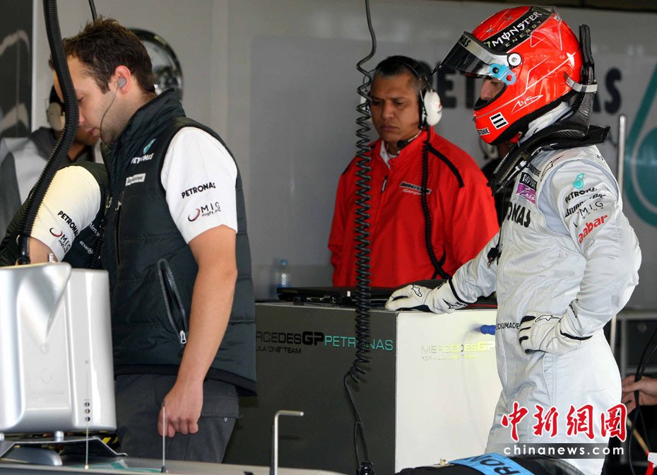 4月16日,2010國際汽聯(lián)F1世界錦標(biāo)賽上海站在上海國際賽車場開始車手第一、第二次練習(xí)賽。圖為代表梅賽德斯GP車隊出戰(zhàn)的老車王、德國車手舒馬赫重回上海賽道。 中新社記者 任晨鳴 攝