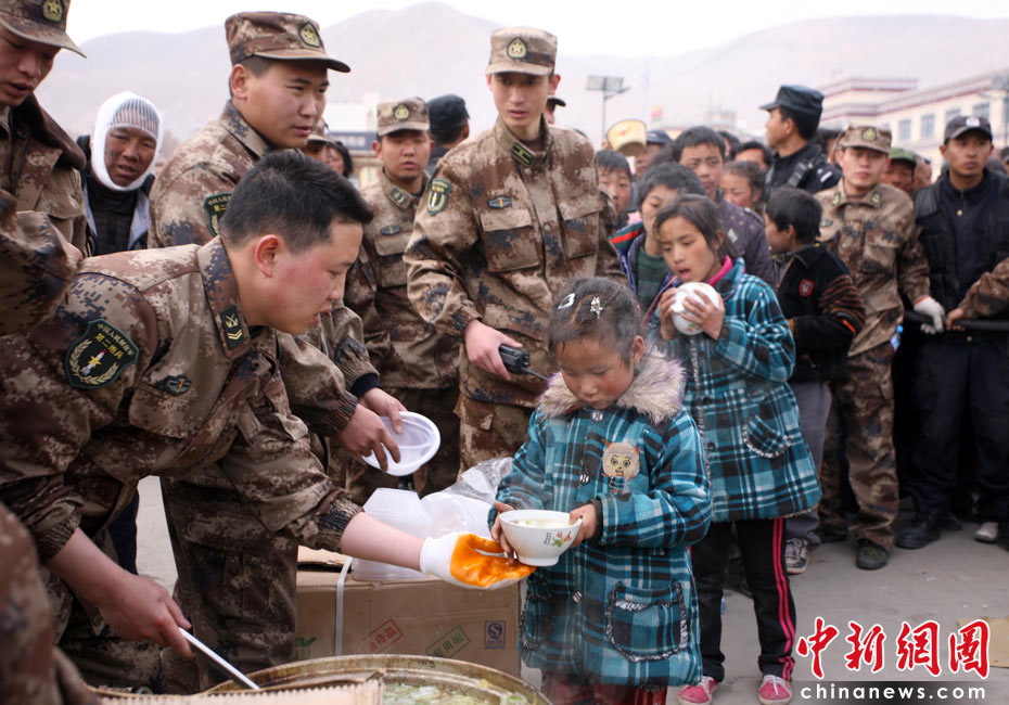 4月16日,青海省玉樹藏族自治州玉樹縣地震發(fā)生第三天,為確保災(zāi)民有飯吃、有帳篷住,玉樹城內(nèi)各個(gè)安置點(diǎn)架起鍋灶為受災(zāi)民眾分發(fā)免費(fèi)食物并幫助搭建帳篷。4月14日07時(shí)49分許,青海省玉樹藏族自治州玉樹縣(北緯33.1,東經(jīng)96.7)發(fā)生7.1級(jí)地震。中新社發(fā) 劉忠俊 攝
