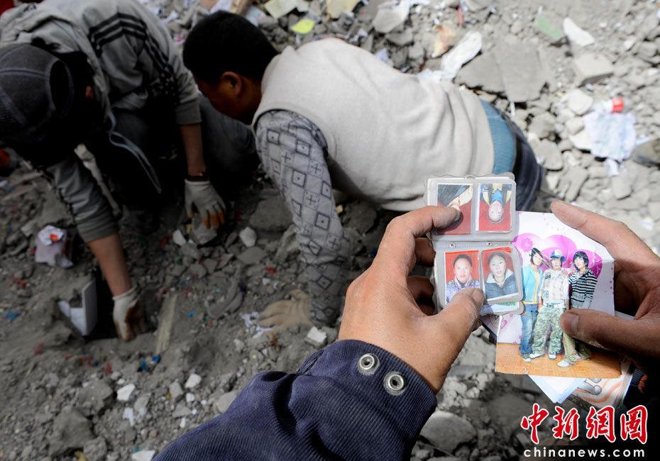 4月16日,青海玉樹民族師范學(xué)校內(nèi),玉樹州教育局官員扎西手持學(xué)生照片焦急等待現(xiàn)場救援進(jìn)展。中新社發(fā) 廖攀 攝