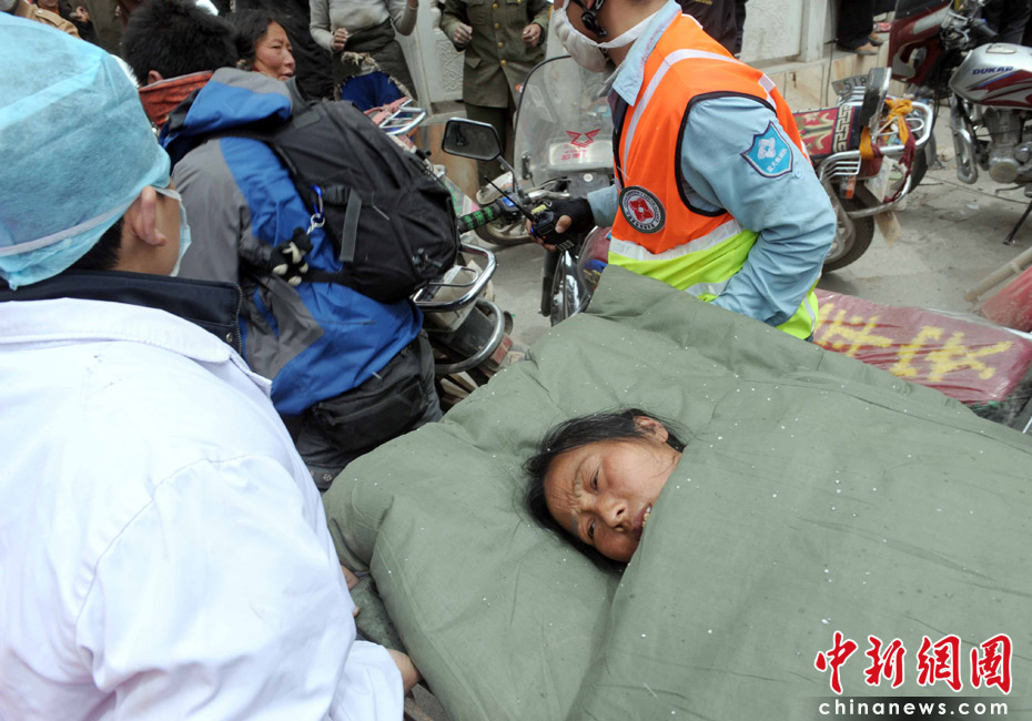 4月17日13點38分許,搜救隊在玉樹結古鎮(zhèn)成功救出一名中年婦女,幸存者神志清醒,還睜著眼睛,據(jù)悉腿部、腰部受傷。中新社發(fā) 陳文 攝