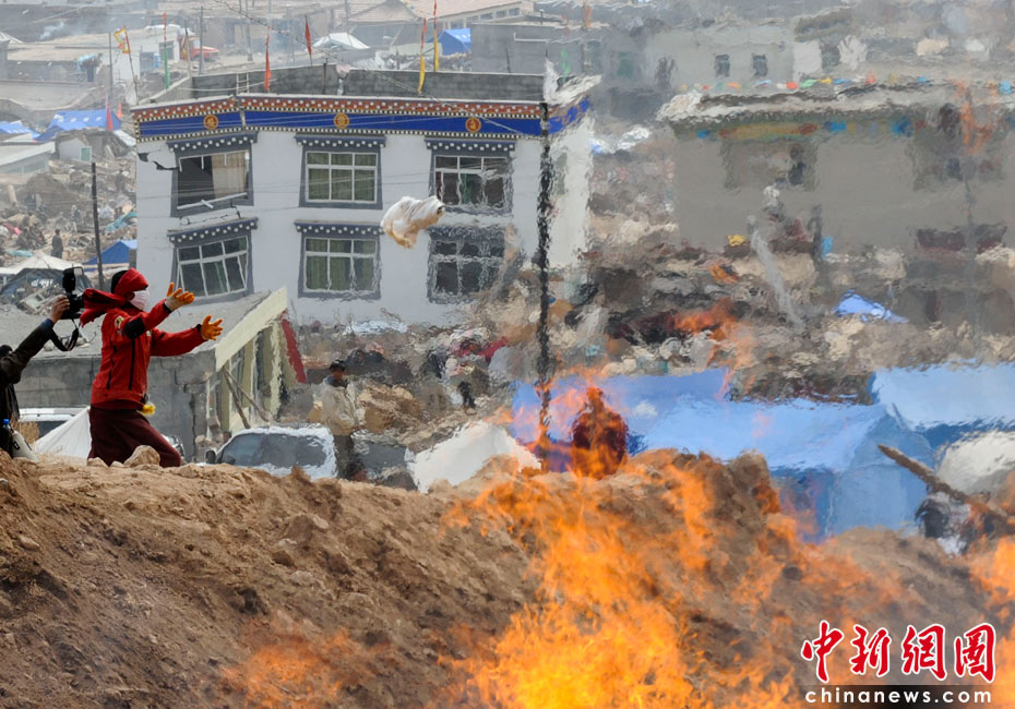 4月17日,青海省玉樹(shù)縣結(jié)古鎮(zhèn)附近的山坡上,眾多地震遇難者遺體被火葬。當(dāng)日,為妥善及時(shí)處理遇難人員遺體,預(yù)防災(zāi)區(qū)疫情的發(fā)生與流行,青海出臺(tái)地震遇難人員遺體處理意見(jiàn),強(qiáng)調(diào)在處理遺體時(shí)要尊重少數(shù)民族喪葬習(xí)俗,尊重死者尊嚴(yán)。圖為眾多僧侶為逝者祈禱。中新社發(fā) 廖攀 攝