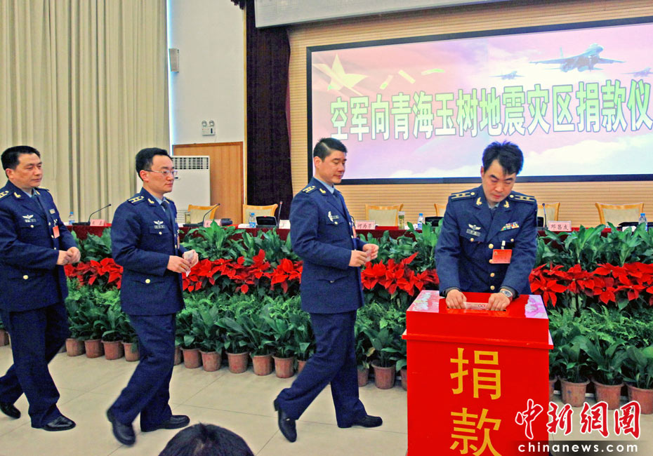 4月17日,中國空軍啟動“空軍向青海玉樹地震災(zāi)區(qū)捐款儀式”,號召全空軍廣大官兵向災(zāi)區(qū)人民捐款。在當(dāng)天的捐款儀式上即捐款13萬多元。這些捐款將在空軍向玉樹捐款活動結(jié)束后,統(tǒng)一送往災(zāi)區(qū)。中新社發(fā) 譚超 攝