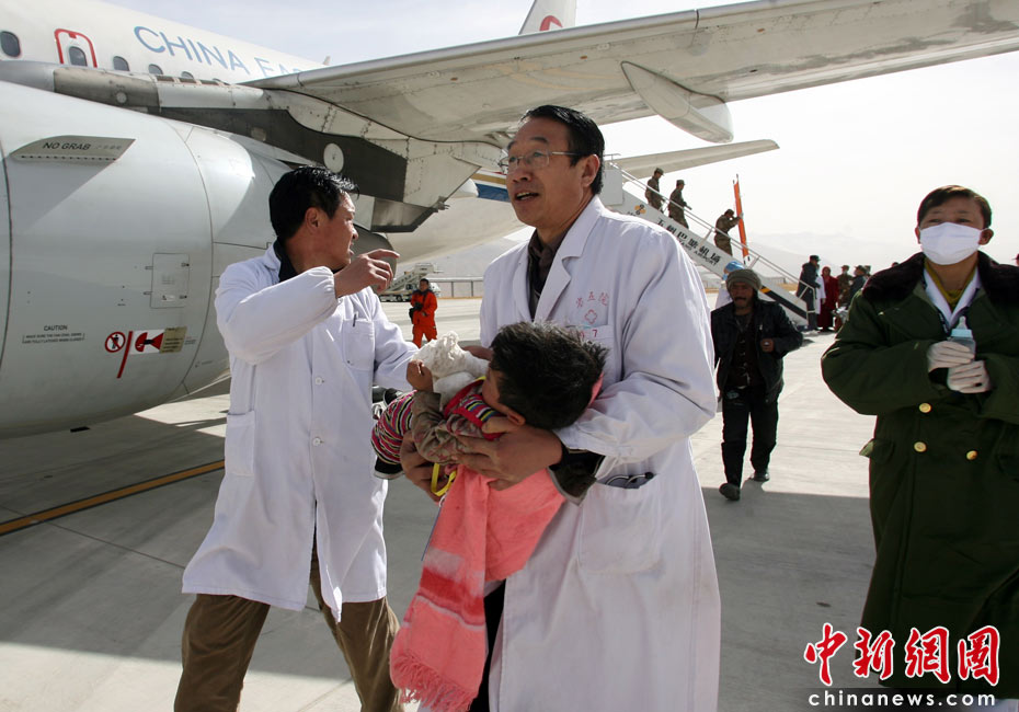 4月18日,青海省第五人民醫(yī)院院長(zhǎng)吳天俊等在玉樹(shù)機(jī)場(chǎng)搶運(yùn)受傷嬰兒。中新社發(fā) 蘇丹 攝