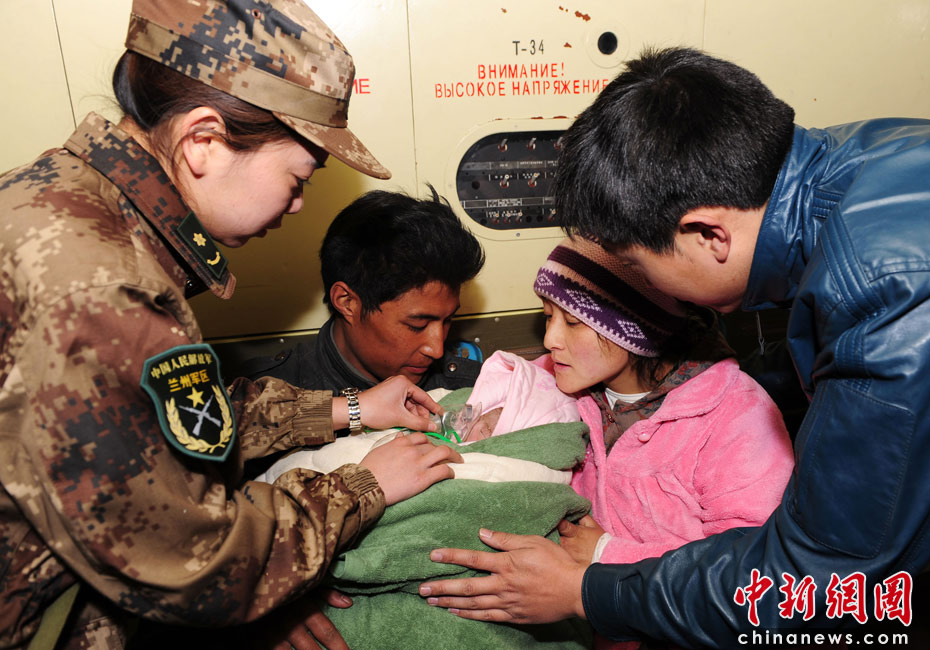 4月18日上午9點10分,剛剛到達玉樹機場正在卸下救災物資的廣空運輸航空兵某師劉軍機組,聽說有名早產(chǎn)兒急需轉送蘭州軍區(qū)總醫(yī)院救治,僅用15分鐘準備,9點25分飛機提前起飛。懷孕8個多月藏族婦女尼瑪拉毛,由于地震驚嚇導致早產(chǎn)。當日凌晨4點轉院途中,在蘭州軍區(qū)323醫(yī)院婦產(chǎn)醫(yī)生王小特、盧小娟的幫助下,產(chǎn)下一男嬰。由于早產(chǎn)、產(chǎn)程長,嬰兒嚴重缺氧,發(fā)生紫疳,為了盡快挽救嬰兒生命,準備轉往蘭州軍區(qū)總醫(yī)院。圖為蘭州軍區(qū)323醫(yī)院救護隊員隨機救護。中新社發(fā) 沈玲 攝