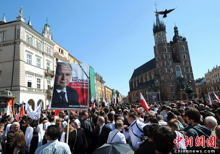 當(dāng)?shù)貢r(shí)間4月18日,卡欽斯基夫婦的葬禮在波蘭南部城市克拉科夫舉行。波蘭總統(tǒng)卡欽斯基及其夫人乘坐的專機(jī)10日在俄羅斯斯摩棱斯克失事,機(jī)上人員全部遇難。圖片來源:中國(guó)新聞網(wǎng)