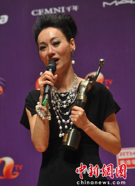 4月18日晚,“第二十九屆香港電影金像獎”頒獎典禮在香港文化中心大劇院隆重舉行,影星惠英紅憑演出電影“心魔”奪得最佳女主角獎項(xiàng)。圖為惠英紅手持獎座向媒體暢談感受。 中新社發(fā) 鄧慶樂 攝