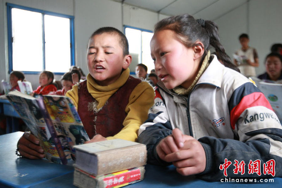 4月18日,70多名孩子在地震四天后重新走進(jìn)了課堂,玉樹州孤兒學(xué)校成為了地震災(zāi)區(qū)第一所復(fù)課的學(xué)校,剛完成帳篷搭建的青海省玉樹藏族自治州第一民族中學(xué)3個(gè)年級(jí)的學(xué)生也開始復(fù)課。青友 攝