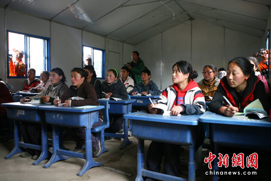 4月18日,70多名孩子在地震四天后重新走進了課堂,玉樹州孤兒學(xué)校成為了地震災(zāi)區(qū)第一所復(fù)課的學(xué)校,剛完成帳篷搭建的青海省玉樹藏族自治州第一民族中學(xué)3個年級的學(xué)生也開始復(fù)課。青友 攝