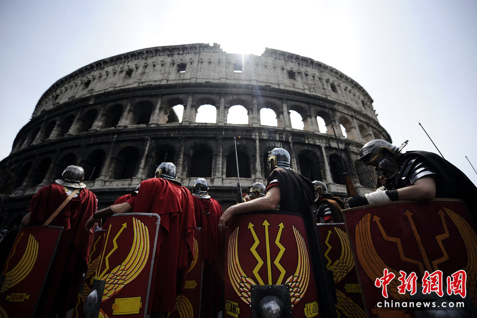 4月18日,意大利羅馬,男子打扮成武士在圓形競技場附近參加游行,慶祝羅馬建城2763周年。圖片來源:中國新聞網(wǎng)