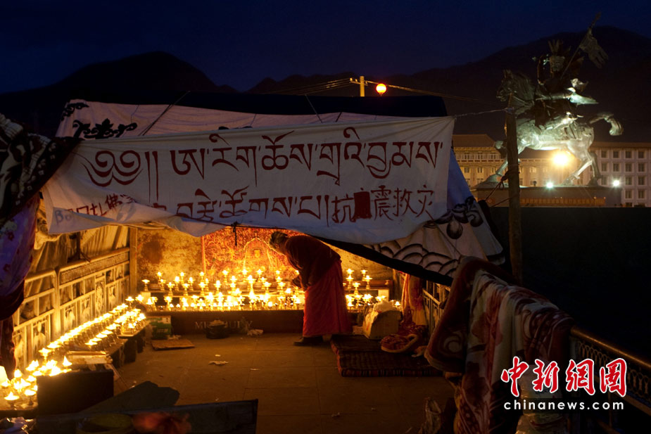 2010年4月18日,青海玉樹結(jié)古鎮(zhèn)格薩爾王廣場,雪域阿日香巴拉凈土五明佛學(xué)院搭建了帳篷,免費為民眾提供酥油燈,為地震遇難者祈禱。中新社發(fā) 盛佳鵬 攝