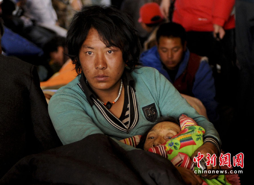 4月19日,從玉樹地震災(zāi)區(qū)飛往西寧的空軍運輸機上,兒子緊擁母親前往西寧轉(zhuǎn)診。中新社發(fā) 廖攀 攝