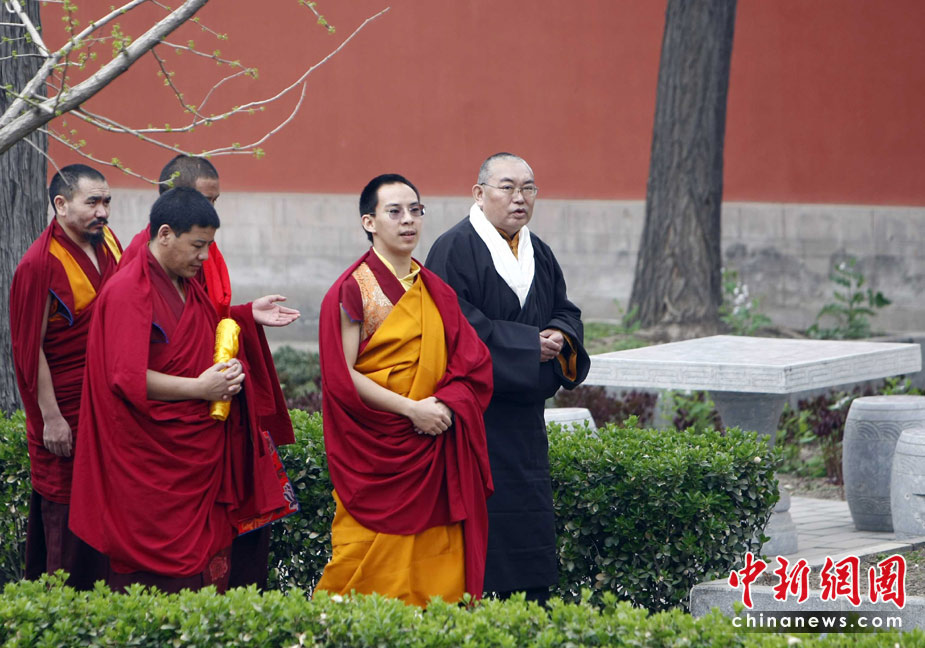4月20日上午9時(shí)許,十一世班禪額爾德尼·確吉杰布和嘉木樣活佛在北京西黃寺,為青海玉樹地震遇難同胞舉行超度法會(huì)。中新社發(fā) 杜洋 攝