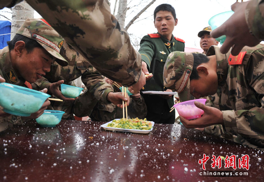 4月20日中午時(shí)分,玉樹地震災(zāi)區(qū)突然雷雹交加,正在現(xiàn)場(chǎng)救援的青海武警總隊(duì)官兵只能在冰雹中吃午餐。中新社發(fā) 賈國榮 攝