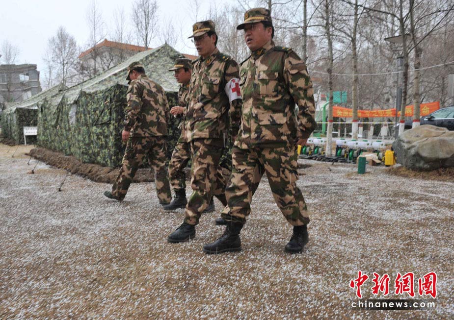 4月20日12時(shí)許,玉樹(shù)地震災(zāi)區(qū)突然雷雹交加,青海武警總隊(duì)醫(yī)療救護(hù)隊(duì)帳篷前一片雪白,軍醫(yī)立刻商量救護(hù)對(duì)策。中新社發(fā) 賈國(guó)榮 攝
