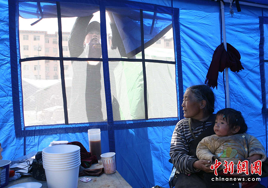 4月20日,玉樹縣結(jié)古鎮(zhèn)1歲的桑寶丹周在帳篷里被外婆抱著,姐姐把帳篷的窗簾拉開,陽光將帳篷照亮。中新社發(fā) 蘇丹 攝