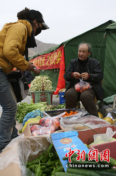4月20日,青海省玉樹縣結(jié)古鎮(zhèn)一位商販在帳篷區(qū)賣新鮮蔬菜。震后玉樹逐步恢復(fù)商品供應(yīng)。中新社發(fā) 蘇丹 攝