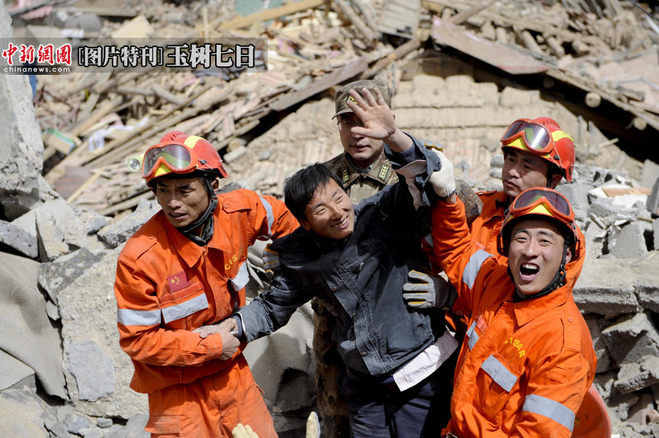 4月15日12時(shí),中國(guó)國(guó)際地震救援隊(duì)在青海玉樹(shù)縣結(jié)古鎮(zhèn)西北牛賓館廢墟上救出了四名幸存者,其間經(jīng)歷了三次余震。中新社發(fā) 廖攀 攝