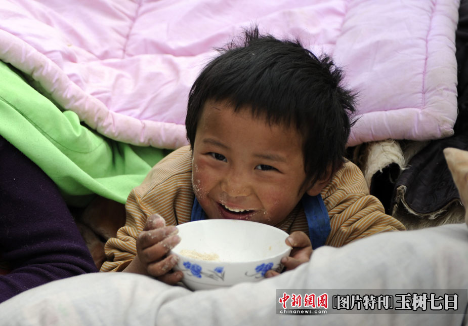 災(zāi)難的來臨無(wú)法選擇,但是面對(duì)災(zāi)難的方式,卻始終掌握在每個(gè)人自己手中。家園被毀,失去親人,傷痛過后生活還要繼續(xù),愿玉樹的受災(zāi)群眾選擇堅(jiān)強(qiáng),用堅(jiān)韌和信心去開創(chuàng)新的生活。 圖為青海玉樹體育場(chǎng)地震民眾安置點(diǎn),一名孩童歡快地吃東西。中新社發(fā) 廖攀 攝
