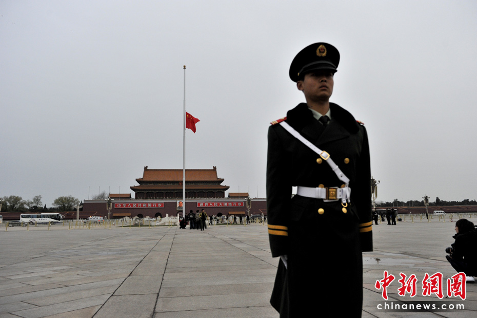 4月21日早晨,北京天安門廣場(chǎng)下半旗向玉樹地震遇難者致哀。中新網(wǎng)記者 金碩 攝
