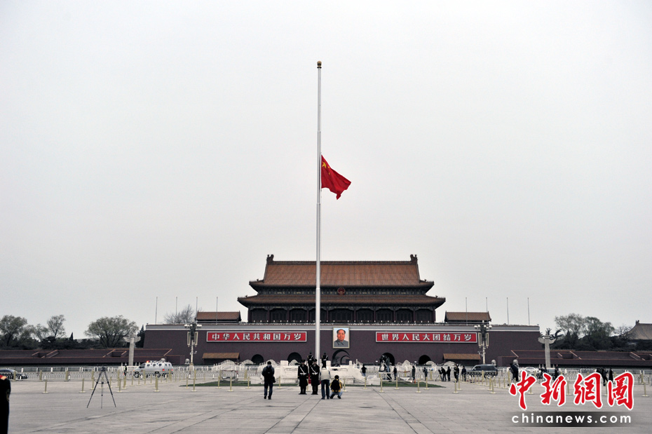4月21日早晨,北京天安門廣場(chǎng)下半旗向玉樹地震遇難者致哀。中新網(wǎng)記者 金碩 攝