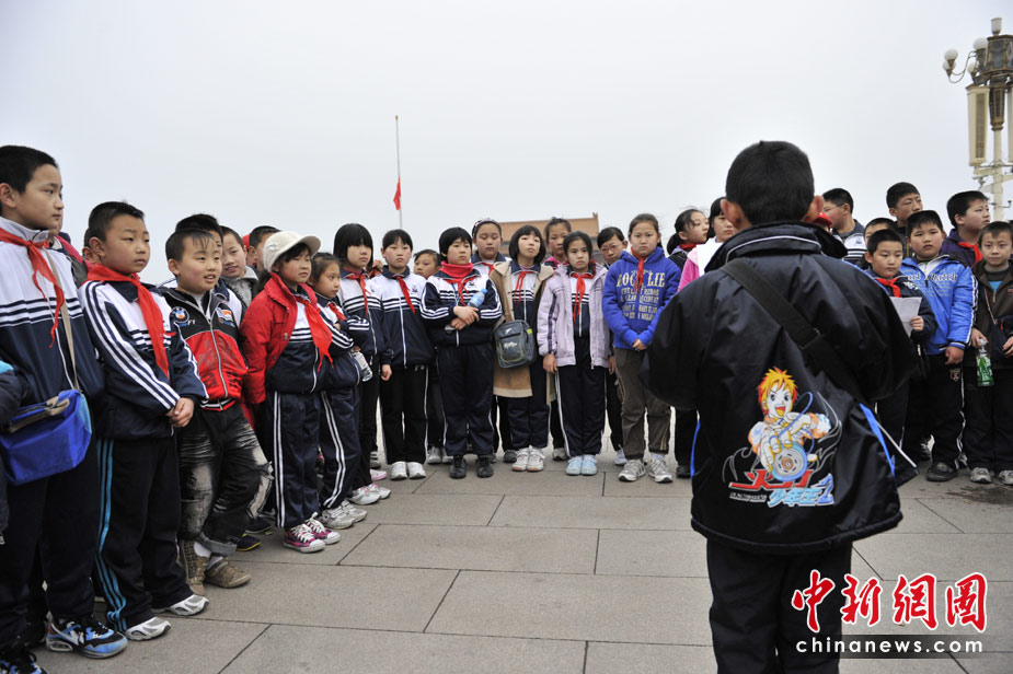 4月21日清晨,廊坊第十二小學(xué)的小學(xué)生來(lái)到天安門廣場(chǎng)朗讀自己的作文悼念青海玉樹地震的遇難同胞。中新網(wǎng)記者 金碩 攝