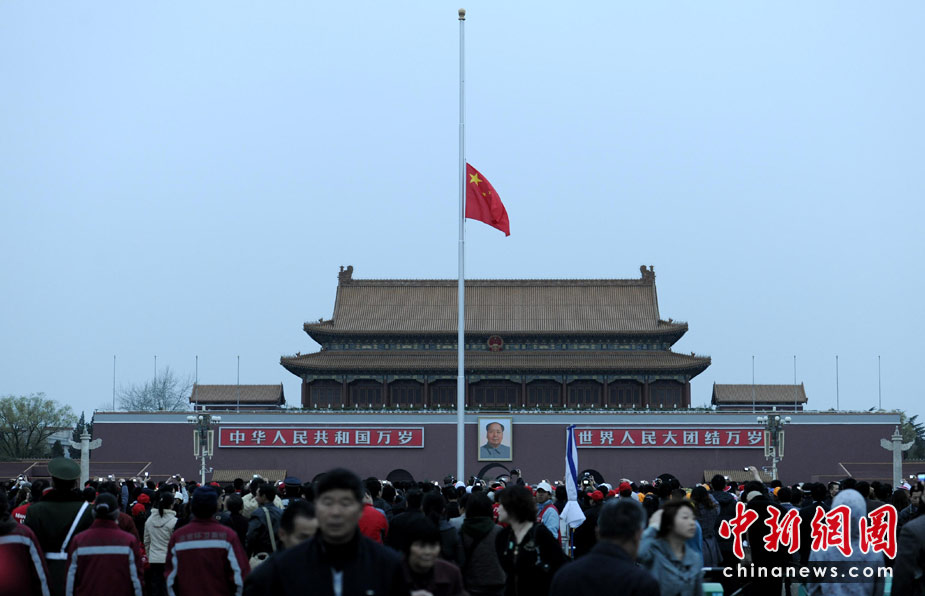 4月21日,北京天安門廣場(chǎng)升國旗儀式結(jié)束后,下半旗向玉樹地震遇難同胞志哀。為表達(dá)全國各族人民對(duì)青海玉樹地震遇難同胞的深切哀悼,中國國務(wù)院決定,舉行全國哀悼活動(dòng),全國和駐外使領(lǐng)館下半旗志哀,停止公共娛樂活動(dòng)。中新社發(fā) 劉震 攝