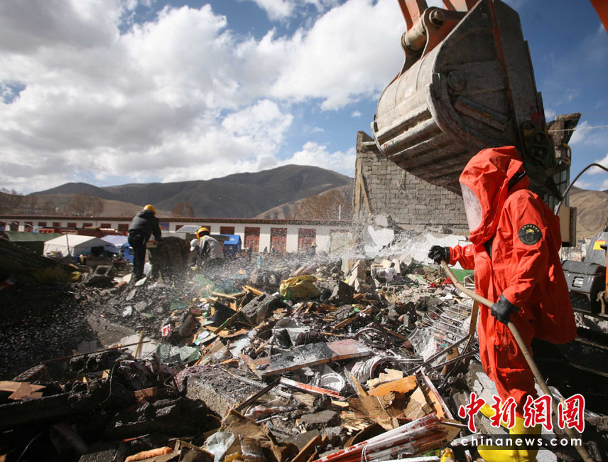 4月20日,來自四川內(nèi)江軍分區(qū)陸軍預(yù)備役防化團(tuán)開始對(duì)玉樹城區(qū)廢墟展開消毒工作。地震發(fā)生以后衛(wèi)生部門加強(qiáng)對(duì)震區(qū)消毒防疫工作力度,防疫人員開始對(duì)廢墟、災(zāi)民安置區(qū)展開拉網(wǎng)式消毒防疫,重點(diǎn)預(yù)防鼠疫、水質(zhì)污染,確保大災(zāi)之后無(wú)大疫。中新社發(fā) 劉忠俊 攝