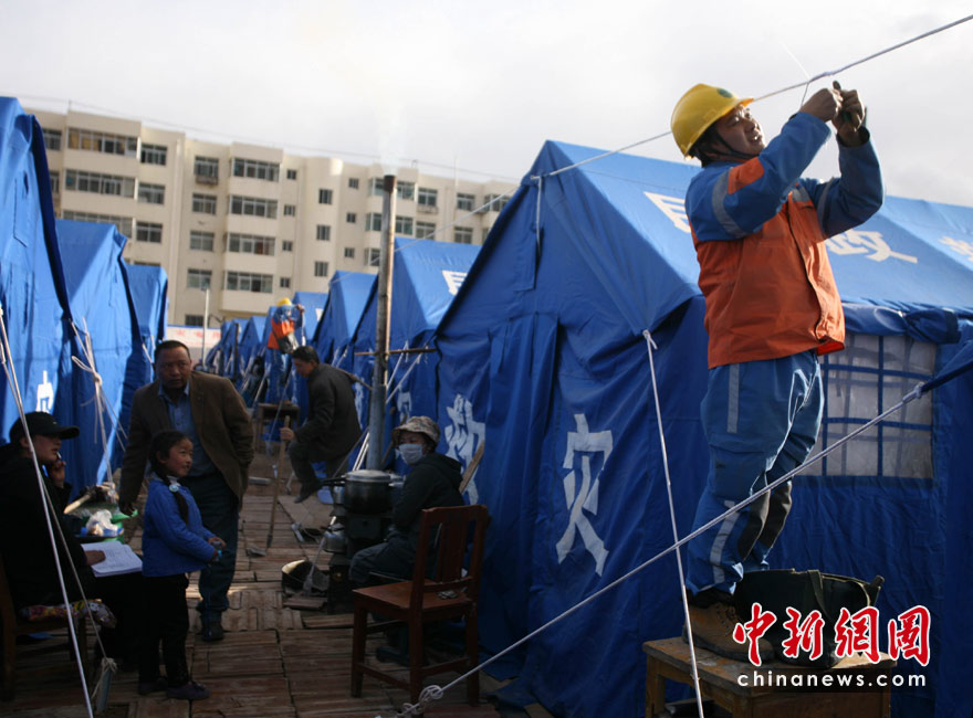 4月20日,國家電網(wǎng)四川公司抗震救災(zāi)突擊隊經(jīng)過辛苦工作,青海玉樹紅旗小學正式恢復供電。這是玉樹第一所恢復供電的學校。圖為來自四川的電力技術(shù)人員正在為40頂帳篷牽線接燈。中新社發(fā) 劉忠俊 攝