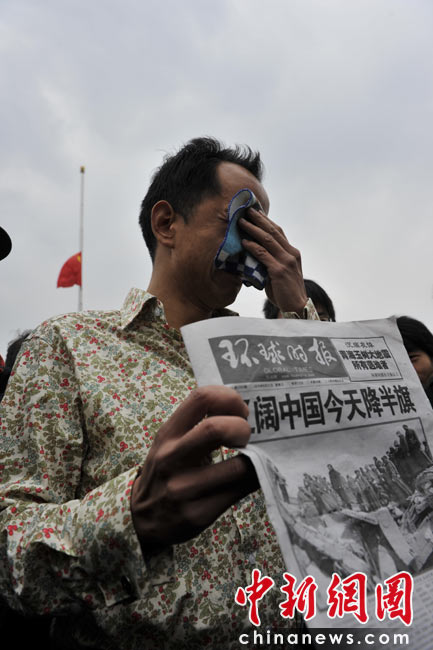4月21日,為表達(dá)全國各族人民對青海玉樹地震遇難同胞的深切哀悼,中國國務(wù)院決定,舉行全國哀悼活動(dòng),全國和駐外使領(lǐng)館下半旗志哀,停止公共娛樂活動(dòng)。圖為北京天安門廣場上哀悼遇難者的民眾。中新網(wǎng)記者 金碩 攝