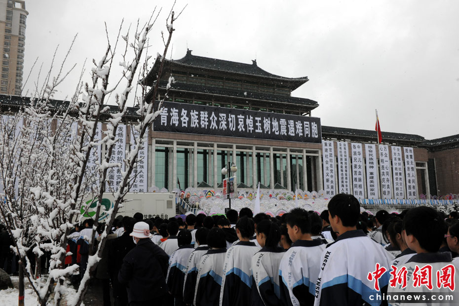 21日上午9時(shí)許,西寧各界民眾冒雪陸續(xù)來(lái)到該市最大的廣場(chǎng)——新寧廣場(chǎng),悼念玉樹地震遇難同胞。中新社記者 符永康 攝