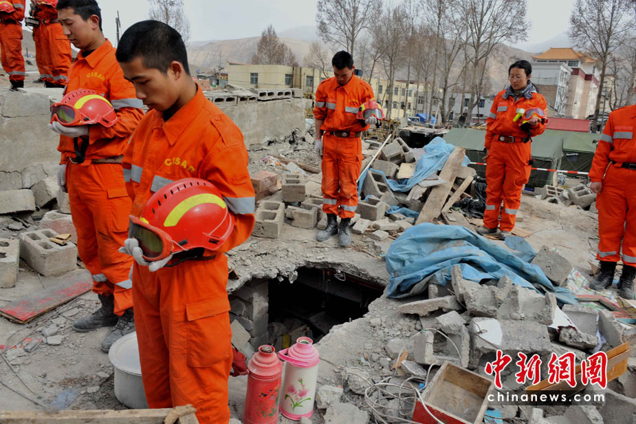 4月21日10時(shí),中國(guó)國(guó)家救援隊(duì)在青海玉樹(shù)地震災(zāi)區(qū)搜尋廢墟上默哀,深切哀悼地震遇難同胞。中新社發(fā) 賈國(guó)榮 攝