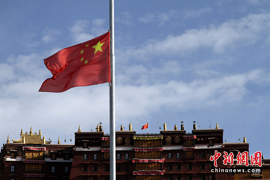 4月21日,西藏布達(dá)拉宮廣場(chǎng)上舉行降半旗儀式。同時(shí),布達(dá)拉宮紅宮頂端的紅旗也降半旗,向青海玉樹(shù)地震遇難者志哀。中新社發(fā) 徐長(zhǎng)安 攝