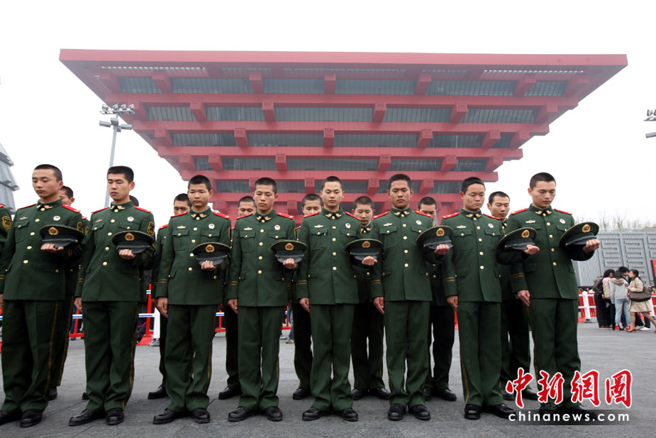 4月21日,上海世博園中國館前,負(fù)責(zé)警衛(wèi)工作的武警官兵向玉樹災(zāi)區(qū)遇難同胞肅立默哀。當(dāng)日,全國舉行哀悼活動(dòng),深切哀悼青海玉樹地震遇難同胞。 中新社發(fā) 張雷 攝