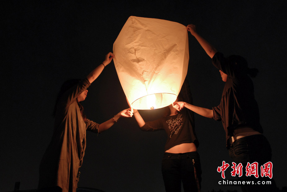 4.21全國(guó)哀悼日晚上,廣東外語(yǔ)外貿(mào)大學(xué)的學(xué)生們?cè)趶V州大學(xué)城內(nèi)點(diǎn)燃孔明燈,為玉樹(shù)地震災(zāi)區(qū)人民祈福。 中新社發(fā) 龍宇陽(yáng) 攝