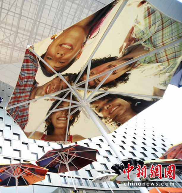 2010年4月22日,上海世博會(huì)主題館門前的觀眾等候區(qū),豎立著一把把遮陽的花傘,每一把花傘上都印著四方友人的燦爛微笑。世博園區(qū)為了應(yīng)對大量客流,園區(qū)設(shè)置了大量遮陽和避雨設(shè)施,遮陽避雨面積總量達(dá)40萬平方米。楊毅 攝