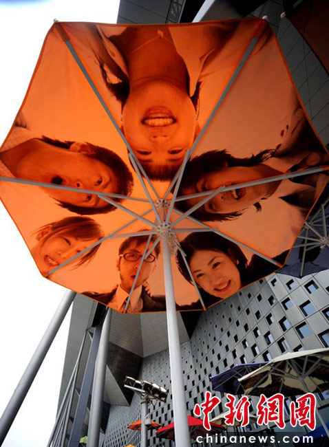 2010年4月22日,上海世博會主題館門前的觀眾等候區(qū),豎立著一把把遮陽的花傘,每一把花傘上都印著四方友人的燦爛微笑。世博園區(qū)為了應(yīng)對大量客流,園區(qū)設(shè)置了大量遮陽和避雨設(shè)施,遮陽避雨面積總量達(dá)40萬平方米。楊毅 攝(CFP)
