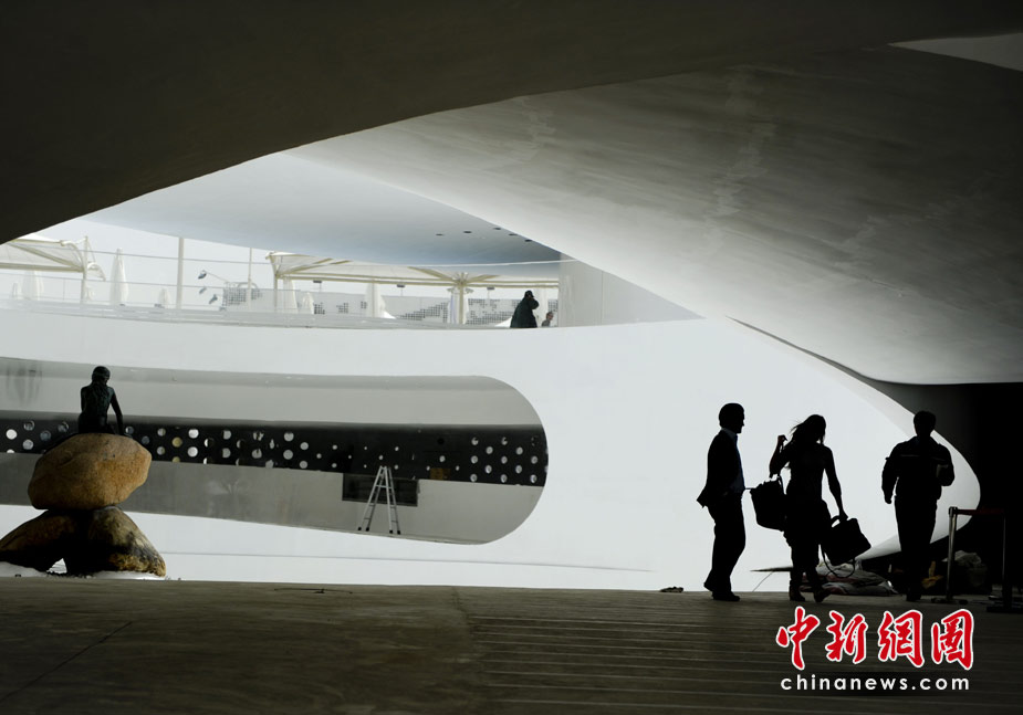 4月27日,上海世博園丹麥館,該館一位女設(shè)計(jì)師走過美人魚雕像。中新社發(fā) 廖攀 攝