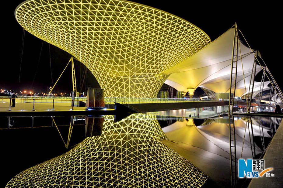 靜待開幕的世博園沉浸在一片暮色中,流光溢彩,給人無限遐想。從外灘到世博園,“夜”上海不斷延伸,讓人激情跳躍。圖片來源:新華網(wǎng)孫巍攝
