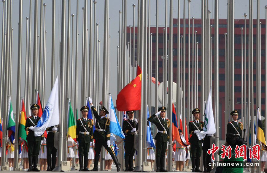 4月30日晚,舉世矚目的上海世博會開幕式將在黃浦江畔世博園區(qū)舉行。圖為上海世博會在世博園區(qū)旗林廣場舉行升旗儀式,200多面旗幟展示了各參展方的風(fēng)采。中新社發(fā) 潘索菲 攝