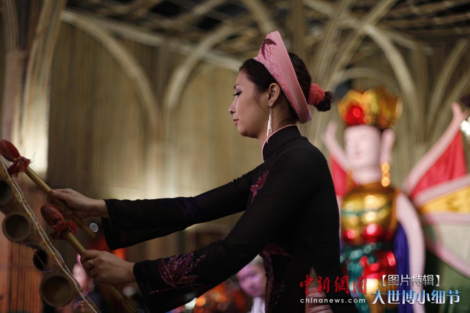 5月1日,上海世博會(huì)正式開(kāi)園,當(dāng)日有20萬(wàn)人次的游客參觀了世博園。世博首日,許許多多的小細(xì)節(jié)都帶給人一種全新的體驗(yàn)。圖為越南館為入館參觀的來(lái)賓演奏獨(dú)特的竹制樂(lè)器。中新社發(fā) 盛佳鵬 攝