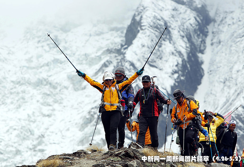 29日(周四),韓國登山運動員吳銀善在到達尼泊爾安納布爾納峰的營地后揮手歡呼。她自認(rèn)是世界上首位登上世界14座最高山峰的女性。