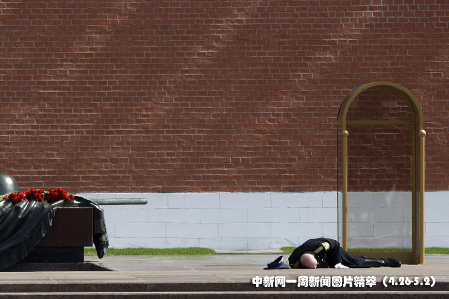 29日(周四),在克里姆林宮,一名俄羅斯士兵被高溫擊倒。