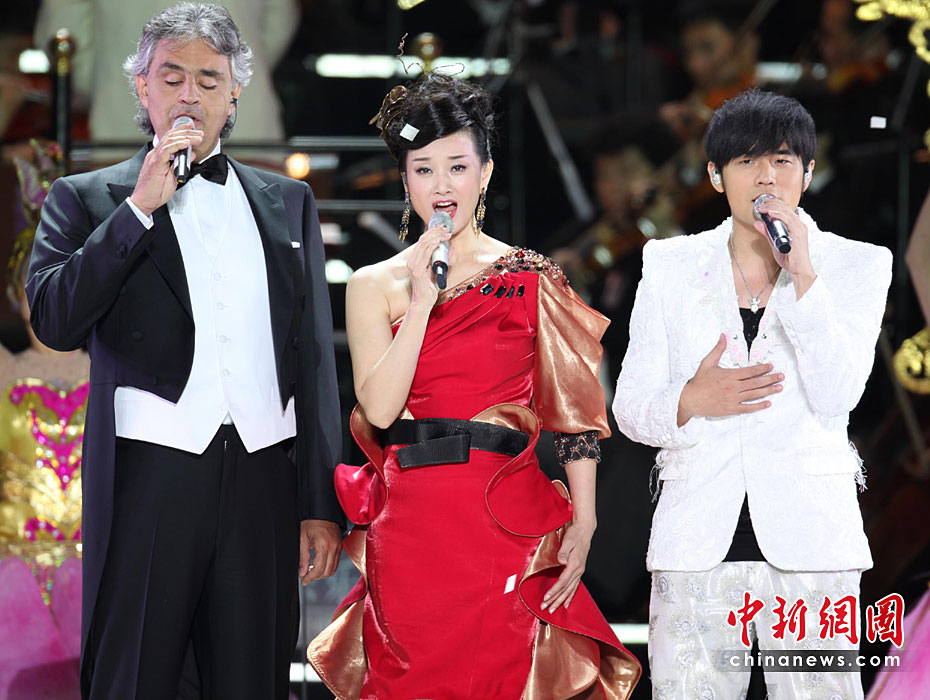 圖為宋祖英、波切利、周杰倫共同演唱“友誼地久天長(zhǎng)”。王保勝 攝