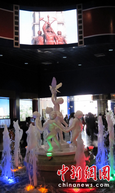 5月2日,上海世博會開園第二天,首次參展世博會的朝鮮館迎來人潮。圖為朝鮮館內(nèi)噴泉涌動,大屏幕上播放著介紹平壤主要景點(diǎn)的影片。中新社發(fā) 姜煜 攝