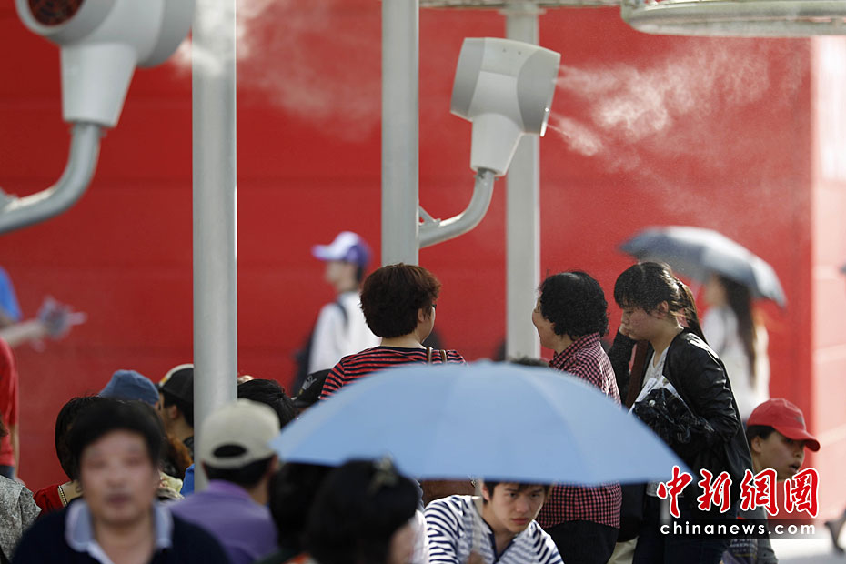 2010年5月2日,上海世博園區(qū)啟動各項控溫降溫設(shè)施應(yīng)對高溫。圖為游客休息區(qū)內(nèi)啟動噴霧降溫系統(tǒng)。中新社記者 盛佳鵬 攝