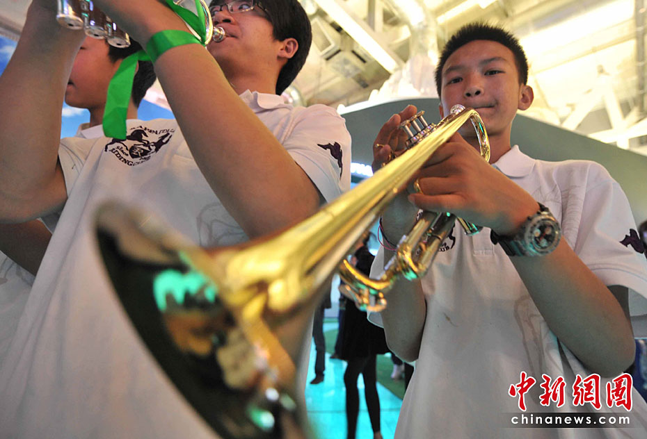 5月2日清晨,來自玉樹地震災(zāi)區(qū)結(jié)古鎮(zhèn)的藏族小樂手巴東珠,含著姐姐在地震中不幸遇難的悲痛心情,與小白楊中學(xué)生管弦樂團來到上海世博會,為中國青海館觀眾獻上一曲《在那遙遠的地方》。他悲歡交融的情懷和演藝,感動全場。巴東珠之前還是青海省人民醫(yī)院為地震傷員做藏語翻譯的志愿者。中新社記者 賈國榮 攝