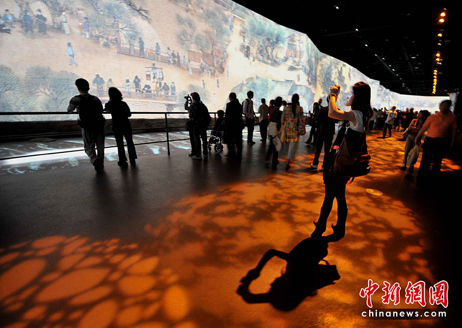 5月2日,中外觀眾依然最熱捧上海世博會中國館的“鎮(zhèn)館之寶”——巨幅放大電子動態(tài)版的北宋畫家張擇端名作《清明上河圖》。此世博版的《清明上河圖》高6.3米,長130余米,約是原圖的30倍,需要12臺電影級的投影儀同時工作。整個活動畫面以4分鐘為一個周期,盡展宋朝盛世的都市日夜風情。中新社記者 賈國榮 攝